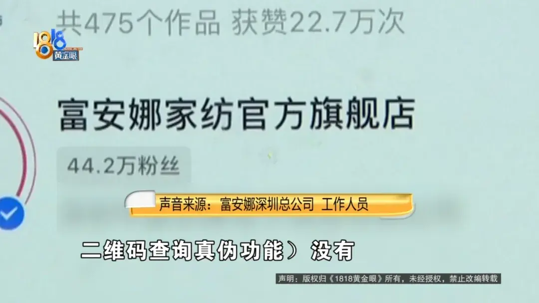 富安娜深圳总公司工作人员:没有关联,应该是假货,我们就是富安娜。核实了之后,那个不是我们授权的,不会以个人的授权的,都是公司授权的。