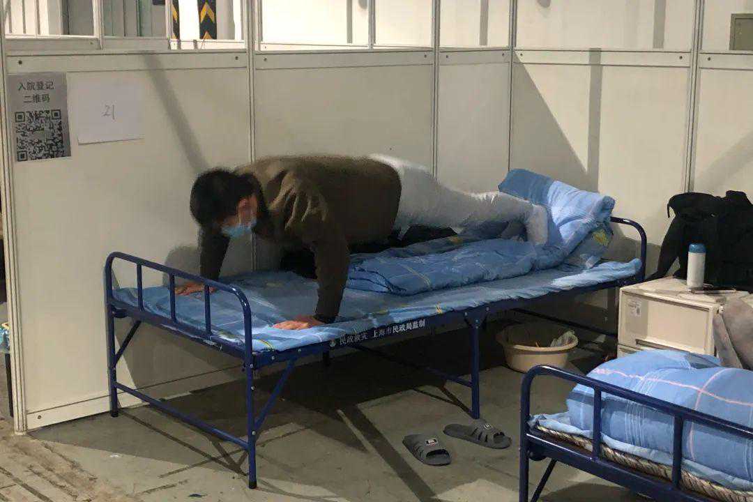 △这个病友是我进方舱医院以来印象最深刻的,我第一次走进方舱过道就看见他在认真地做俯卧撑,而且一口气做了好多个,不禁感叹这哪里像是病人。