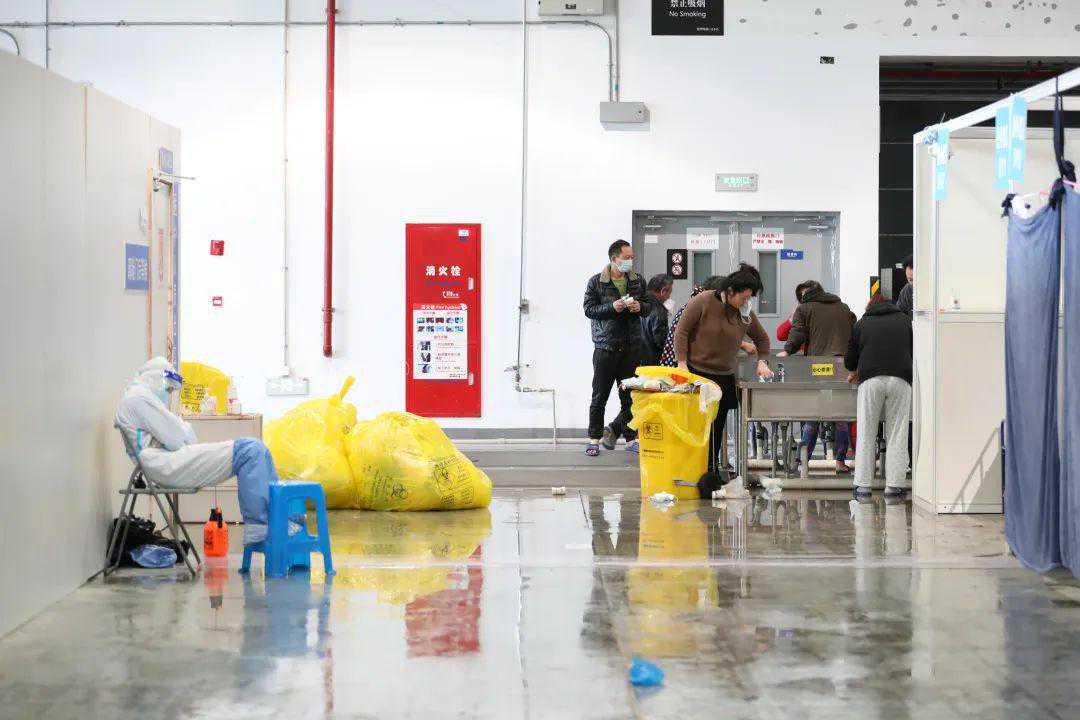 此时的方舱也逐渐开始热闹起来,公用的洗漱台陆续有人前来洗脸刷牙,有的拿着脸盆,有些拿着毛巾,有的甚至就用冷水简单冲冲脸;一些床位的核酸复检工作也已经开启,大白们分组分批给一些可能达到出院标准的病人进行核酸复检。
