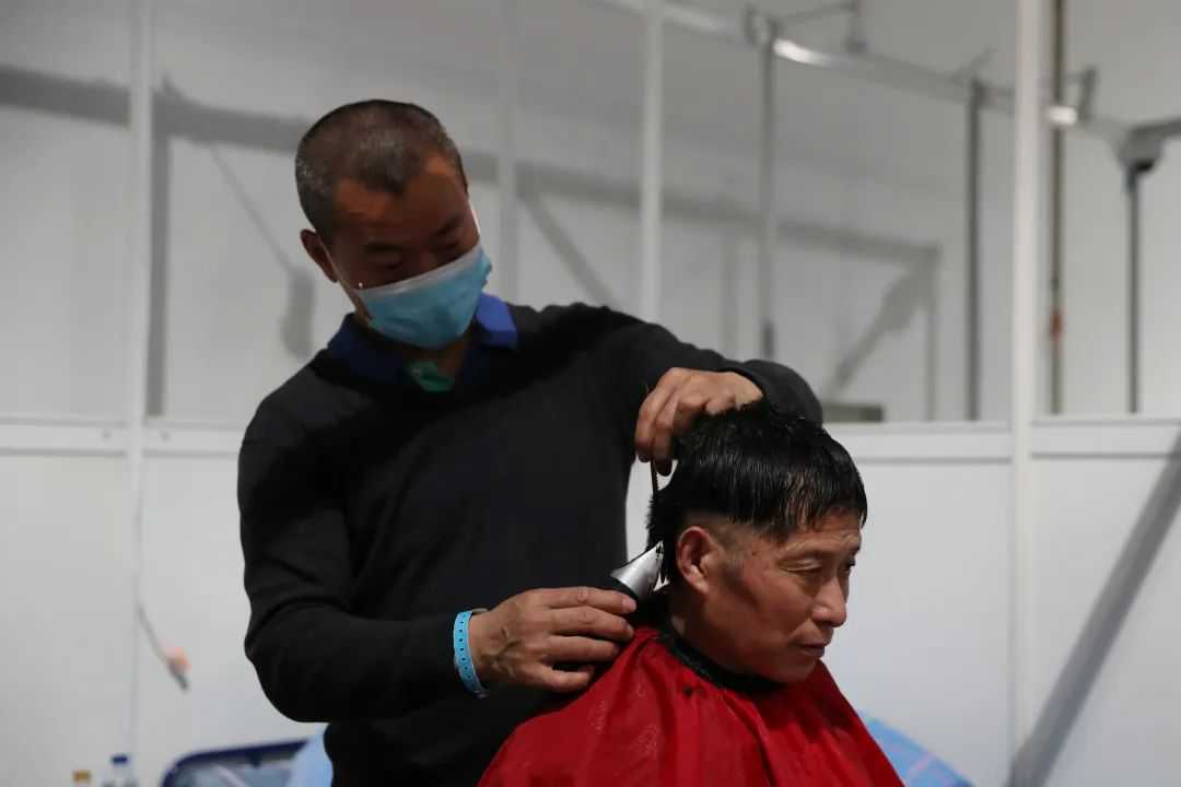 △上午10点04分,世博方舱的“托尼老师”陈师傅正在一位病友理发。